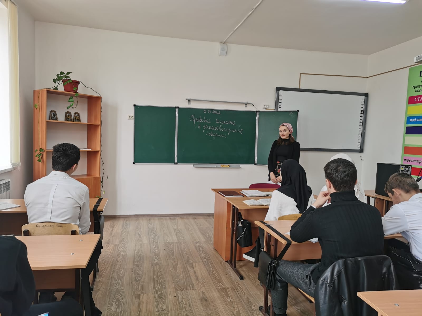 12.04.202212 апреля преподаватель профессиональных дисциплин Исупова Вайдат Хасановна провела классный час на тему «Правовое сознание и законопослушное поведение» у обучающихся. В ходе дискуссии был произведен опрос основных терминов по данной теме. Были подведены итоги, что правовое сознание оказывает воздействие на все сферы жизни.