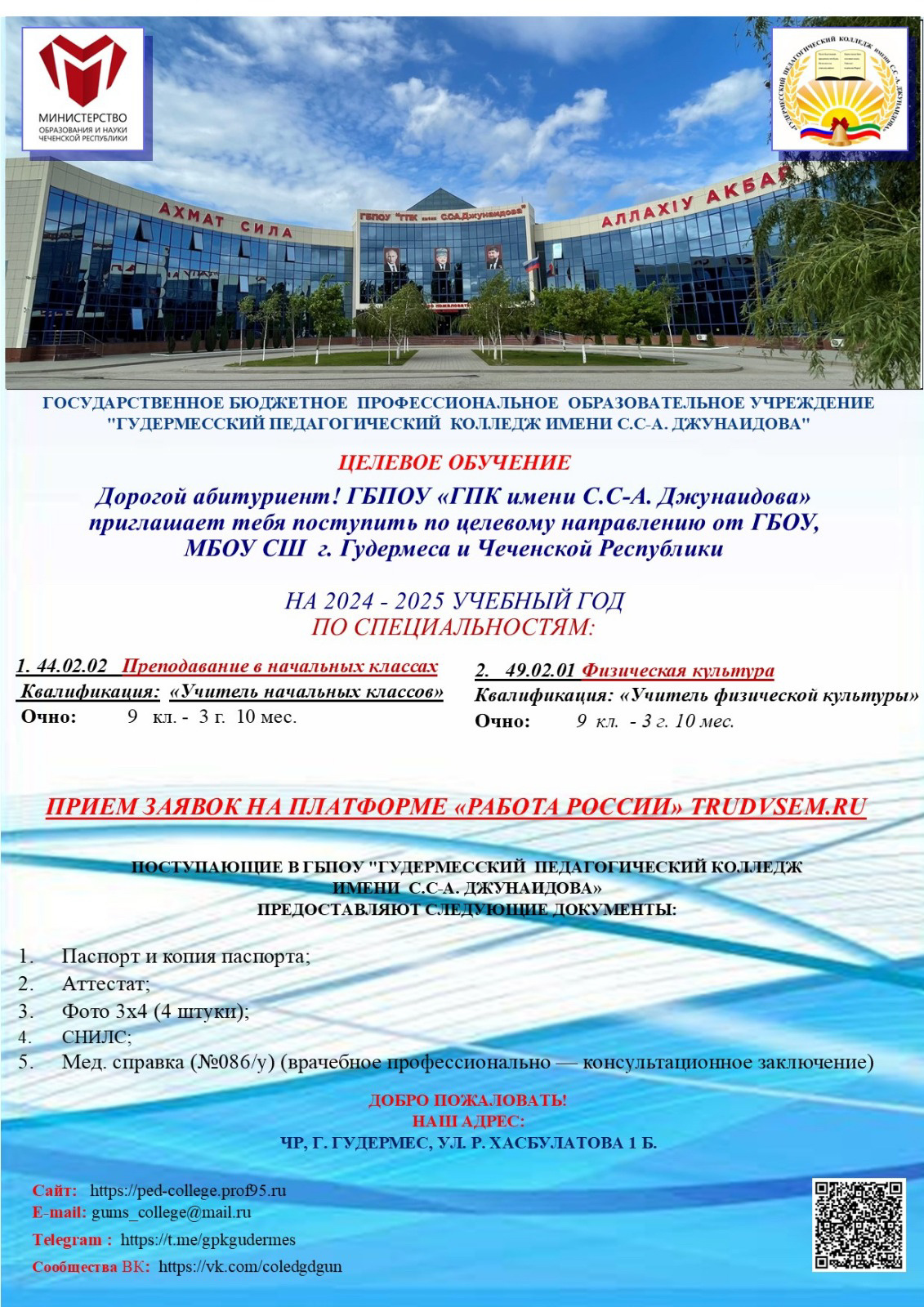 Хочешь стать учителем начальных классов или учителем физкультуры? ГБПОУ «ГПК имени С. С-А. Джунаидова» предлагает тебе уникальную возможность получить качественное образование по целевому направлению от ГБОУ, МБОУ СШ г. Гудермеса и Чеченской Республики!
