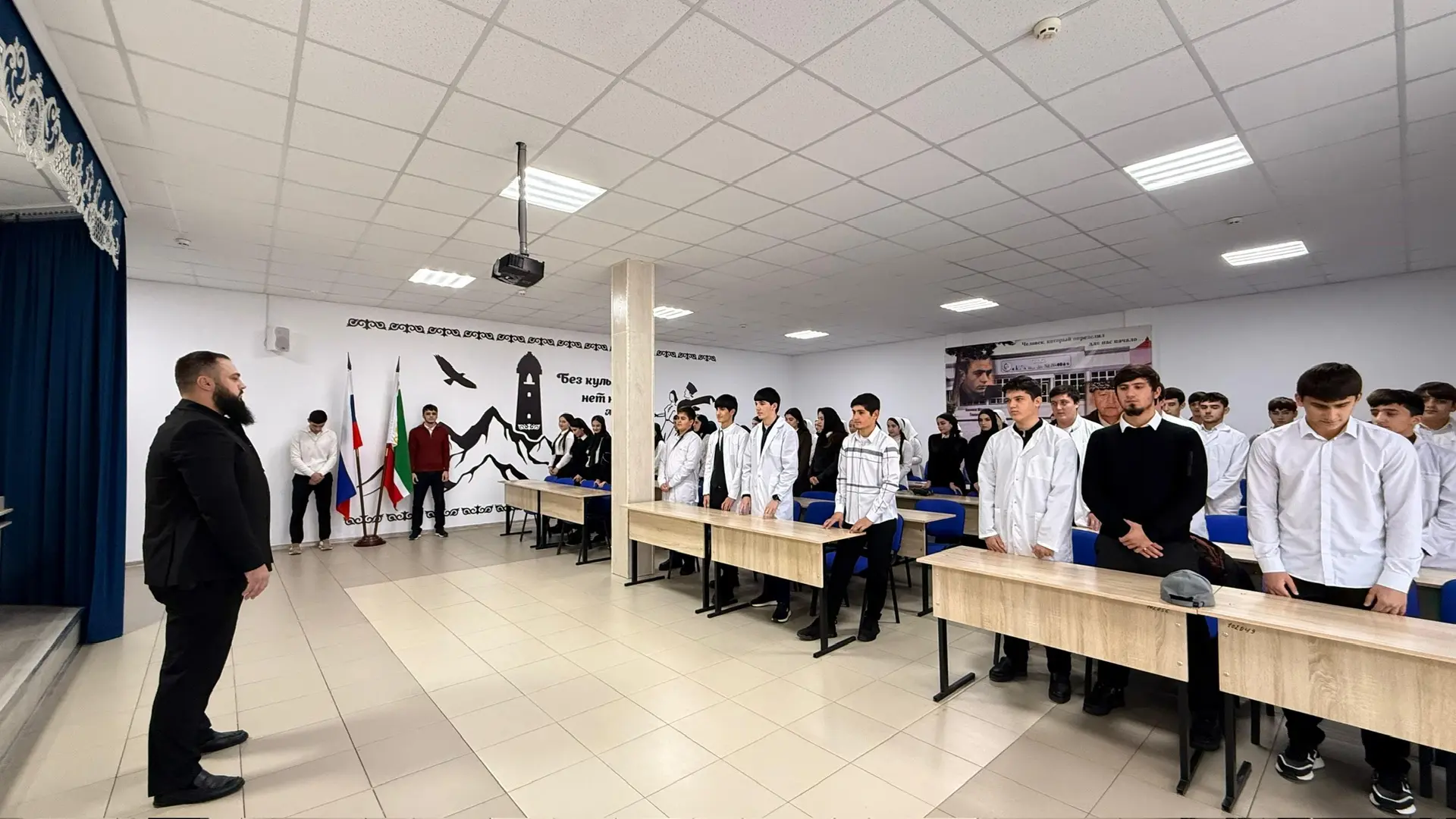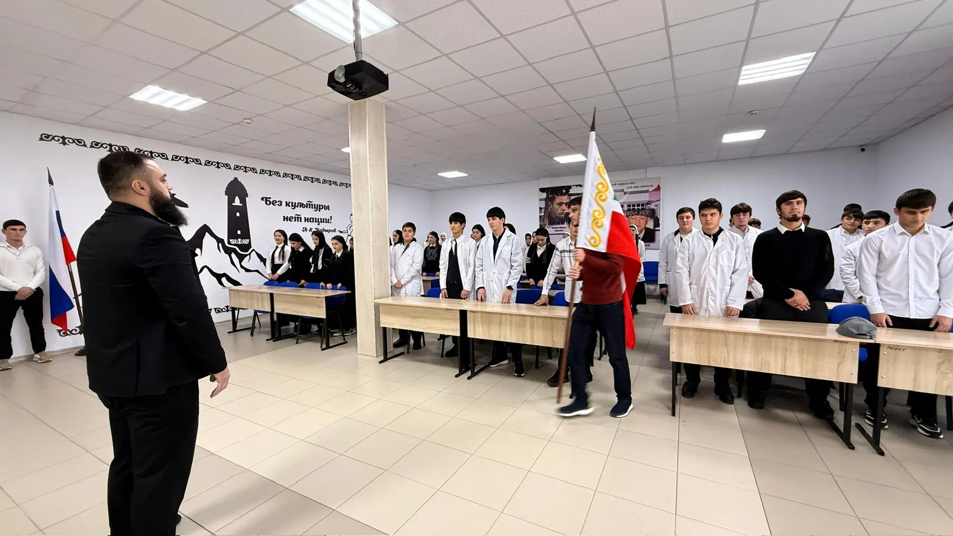 15.12.2025Сегодня в ГБПОУ «КГК им. Ш. Калиева» прошла еженедельная линейка, которая началась с выноса государственного флага Российской Федерации и Чеченской Республики под исполнения Гимнов РФ и ЧР.